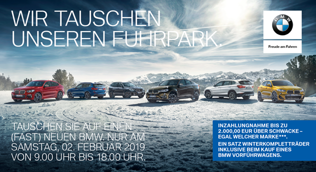 Selbstverständlich bietet unser Fuhrparktausch auch am 2. Februar wieder sensationelle Konditionen: Sie haben die Wahl – Bar, Leasing oder Finanzierung. Wie Sie sich auch entscheiden, so günstig kommen Sie selten zu einem (fast) neuen BMW oder MINI. Dazu bieten wir Ihnen bei Inzahlungnahme Ihres Autos (egal welcher Marke) und Kauf eines sofort lieferbaren BMW bis zu 2.000 Euro über Schwacke. Beim Kauf eines MINI erhalten Sie bis zu 1.000 Euro über Schwacke.
