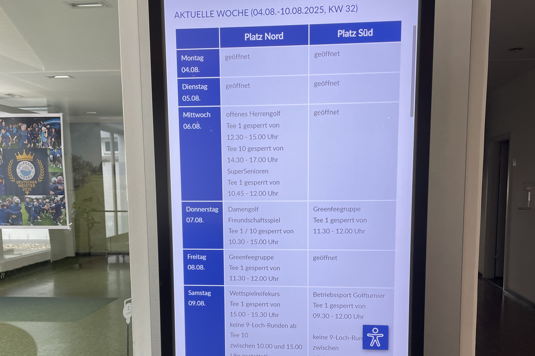 Der Golfclub präsentiert in Touchscreen-Funktion den „Platzbelegungsplan“ Nord-/Süd über die nächsten Tage. Somit können Sie sich sofort einen Überblick über die zeitlichen Platzbelegungen durch Clubturniere und Greenfee-Gruppen usw. verschaffen. Diese Information war bisher auf der Tafel am oberen Puttinggreen ersichtlich. Dies wird auch in einer Übergangszeit weiterhin so bleiben, sodass die analoge als auch die digitale Information ihnen zur Verfügung steht. Leider gab es aber in der Vergangenheit immer wieder mal Irritationen, weil an der analogen Tafel Hinweisschilder verschoben wurden. Mit der digitalen Informationen ist eine belastbare Information gesichert und schneller durch die Verwaltung bereitgestellt.