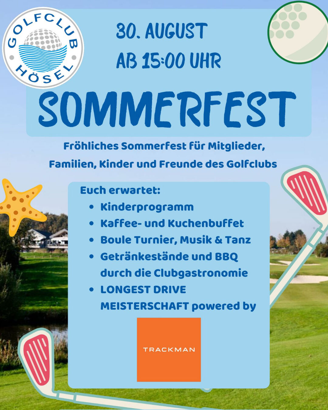 Der Golfclub Hösel lädt alle Mitglieder, Freunde und Familien herzlich zu unserem großen Sommerfest 2025 ein! Freuen Sie sich auf ein lebendiges Gemeinschaftserlebnis voller Spaß, Genuss und Musik – für alle Generationen!