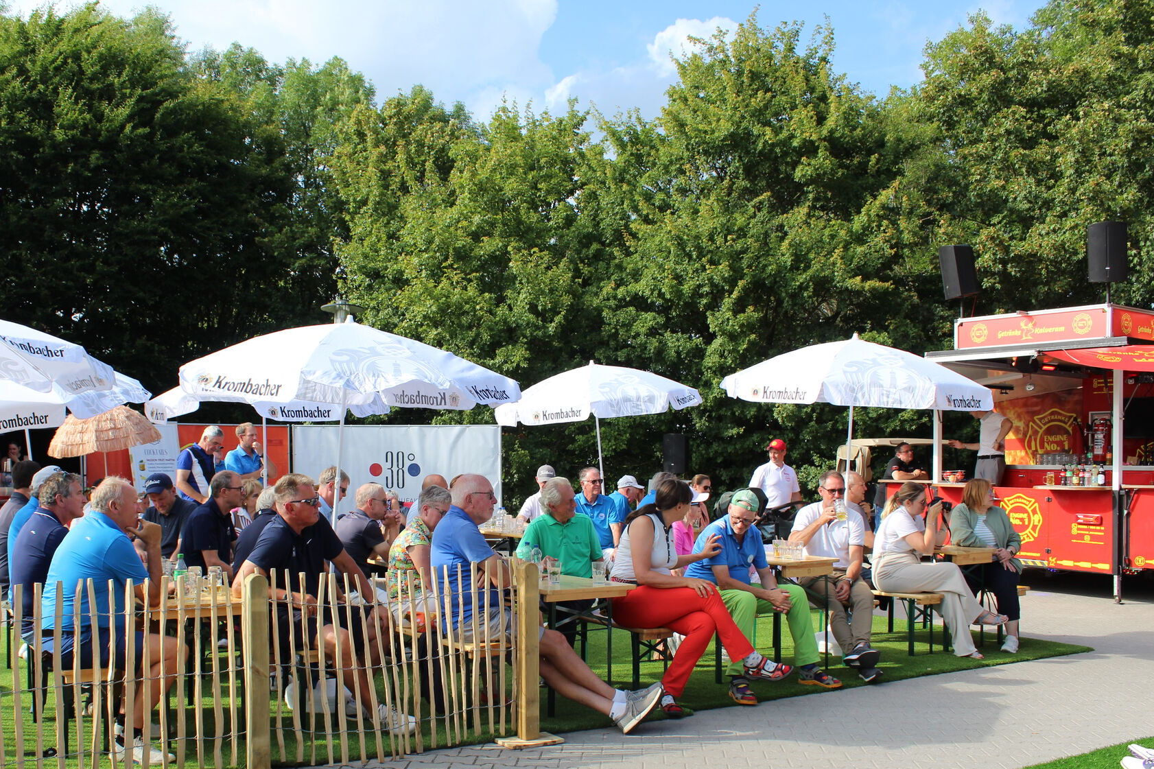 Mit 80 Teilnehmern war das Turnier vollständig ausgebucht, kein Wunder, denn es wurde Einiges geboten. Nicht nur das Nearest to the Bierfass war neu, auch die anschließende Biergartenparty mit Cocktails, Liegestühlen, Kunstrasen, reichlich Kaltgetränken, Fotowand, etc. auf dem Parkplatz waren ein Novum im Turnierbereich des GC Hösel.